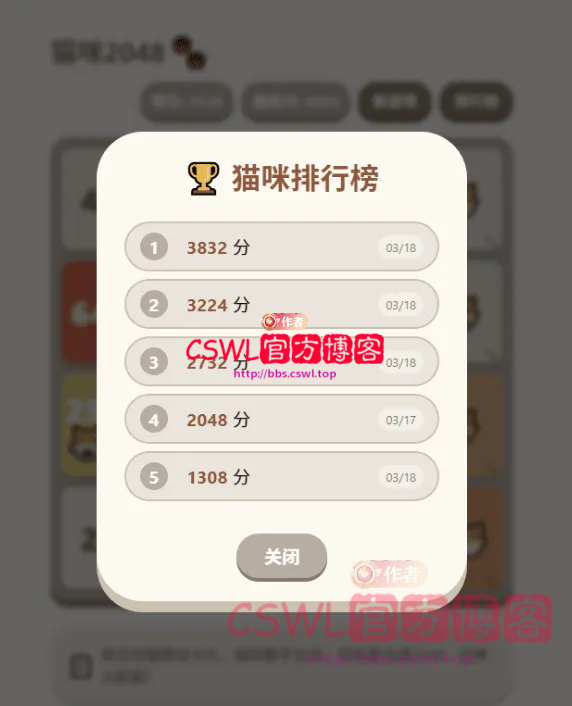 便捷操作与视觉反馈:界面顶部实时显示当前得分和历史最高分,点击“新游戏”可随时重启。胜利时弹出萌系弹窗,点击“喵~”即可关闭。排行榜按钮可随时查看历史最佳成绩,弹窗设计圆润可爱,与游戏风格一致。