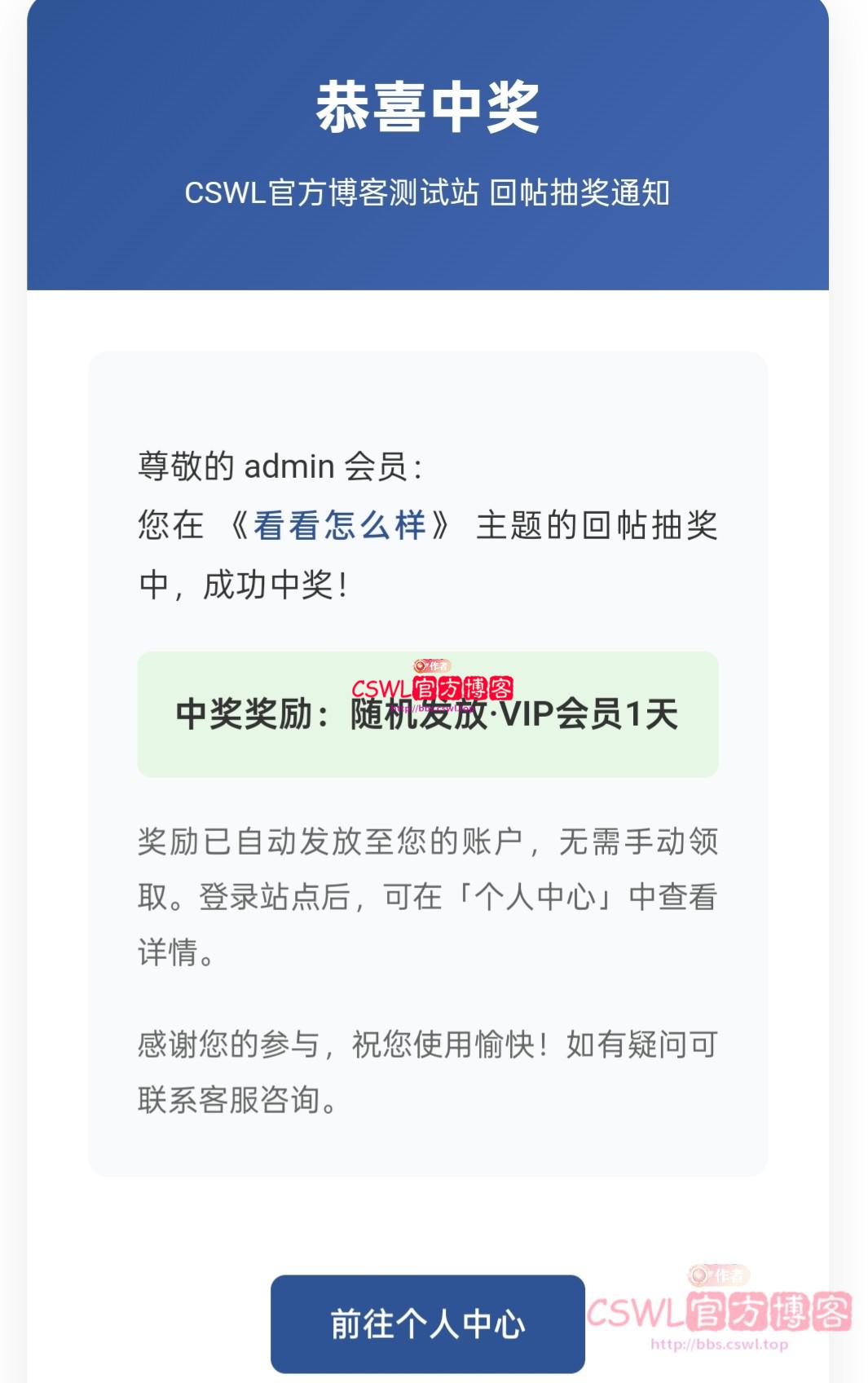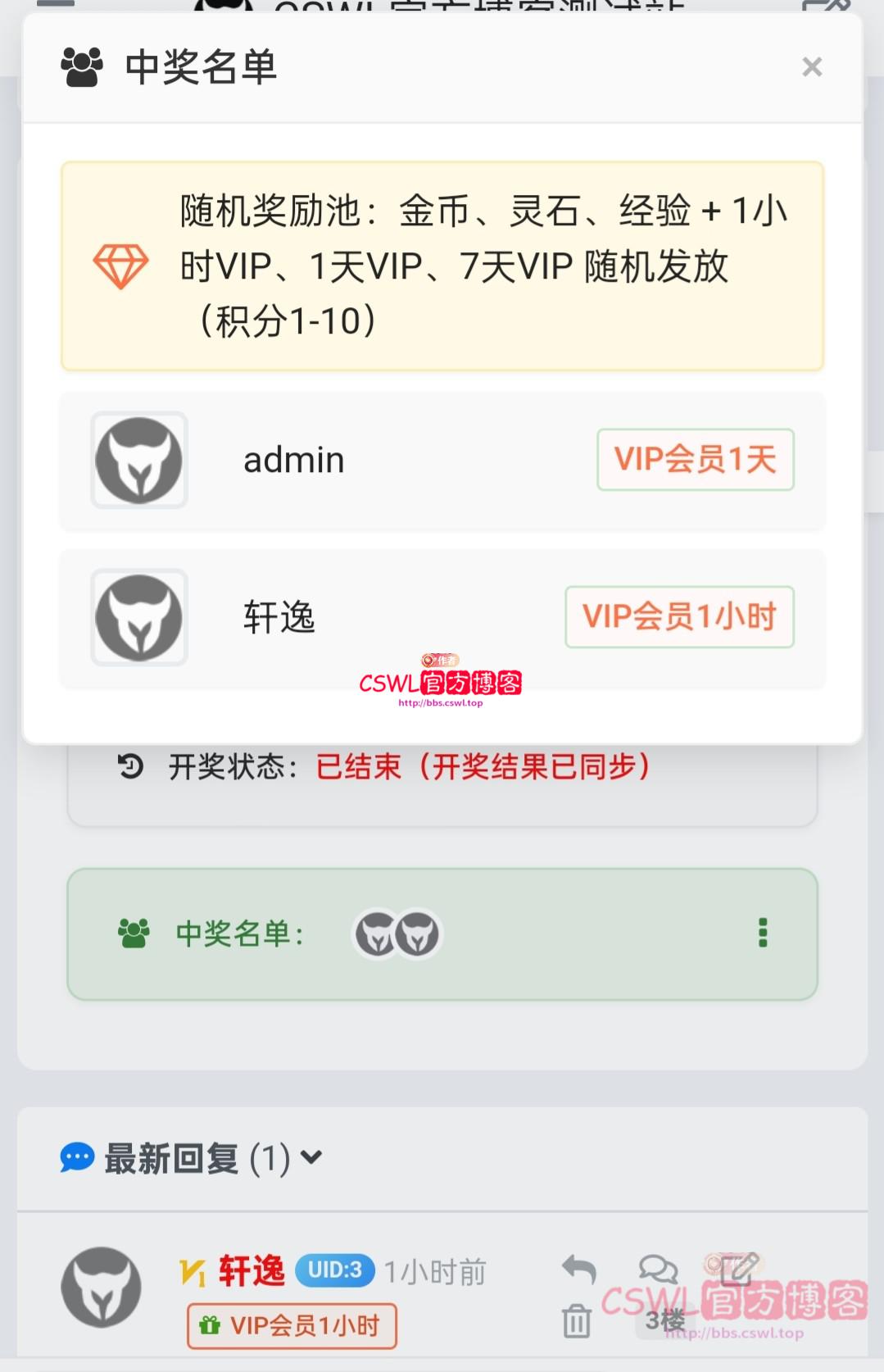 管理员配置:支持设置3类奖品(金币/灵石/经验、1-7天VIP、6种随机奖池),可自定义奖励数量、中奖人数、开奖倒计时(小时计)